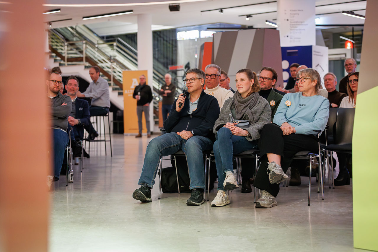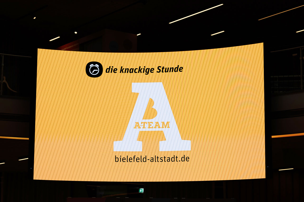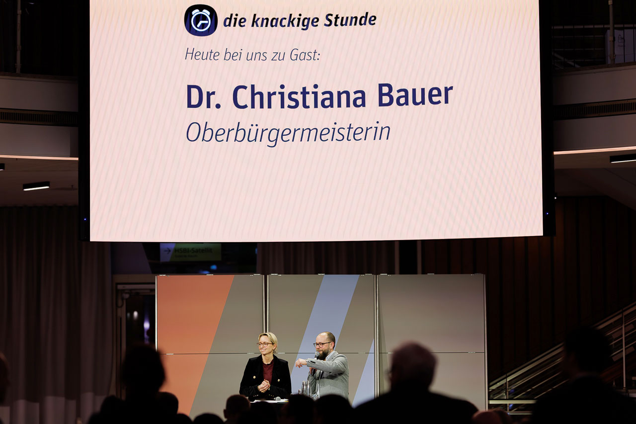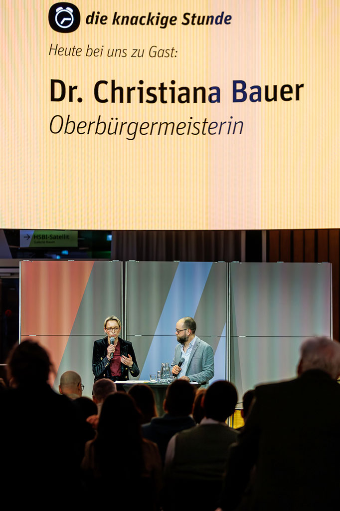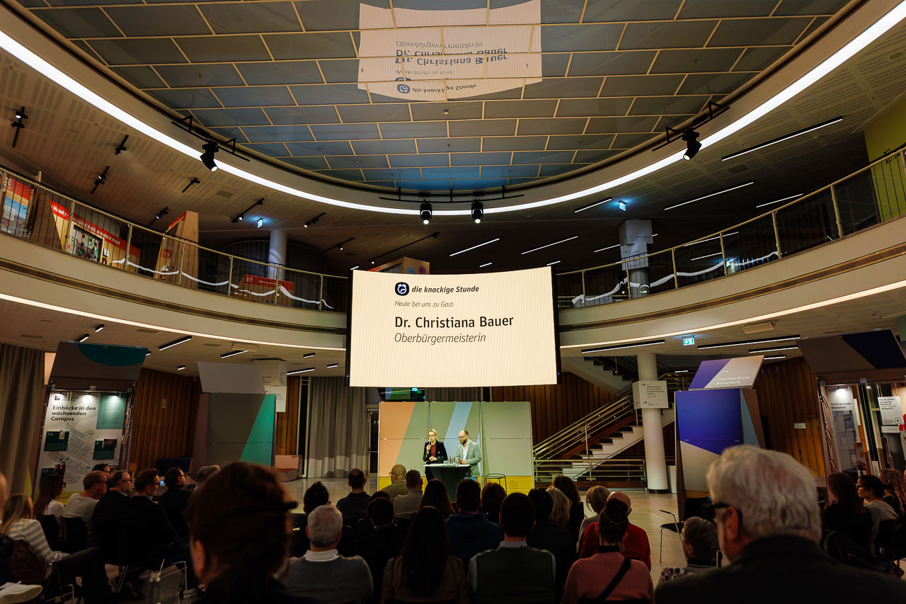 Die Knackige Stunde mit Dr. Christiana Bauer in der Bielefelder Wissenswerkstatt. Mitglieder stellen Fragen nach 100 Tagen Amtszeit.